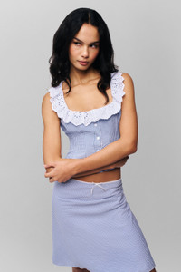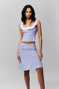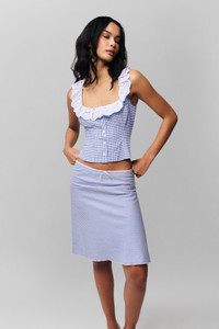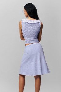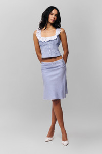 - Pull-on gingham midi skirt featuring scalloped waist, a flounced hem, and an elastic waistband. - Composition: 100% Polyester - Thalita is wearing a size S and is 5'9" with a 32" bust, 35" hips, and 23" waist