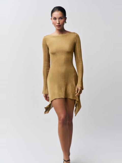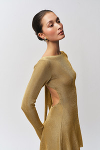 Yada is wearing a size XS and is 5'9" with a 32" bust, 34" hips, and 24" waist - Make a statement with our Rose Dress, crafted from shimmering slinky knit for a touch of glamour. This straight neck, long sleeve mini dress features a flattering fit that accentuates your silhouette, making it perfect for both day and night looks. The sparkly fabric catches the light beautifully, ensuring you stand out in any setting. Plus, the charming bow detail in the back adds a playful touch, elevating your style even further. - Matching undergarment included. - Composition: - 72% Viscose 28% Metallic - Yada is wearing a size XS and is 5'9" with a 32" bust, 34" hips, and 24" waist