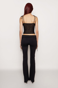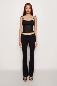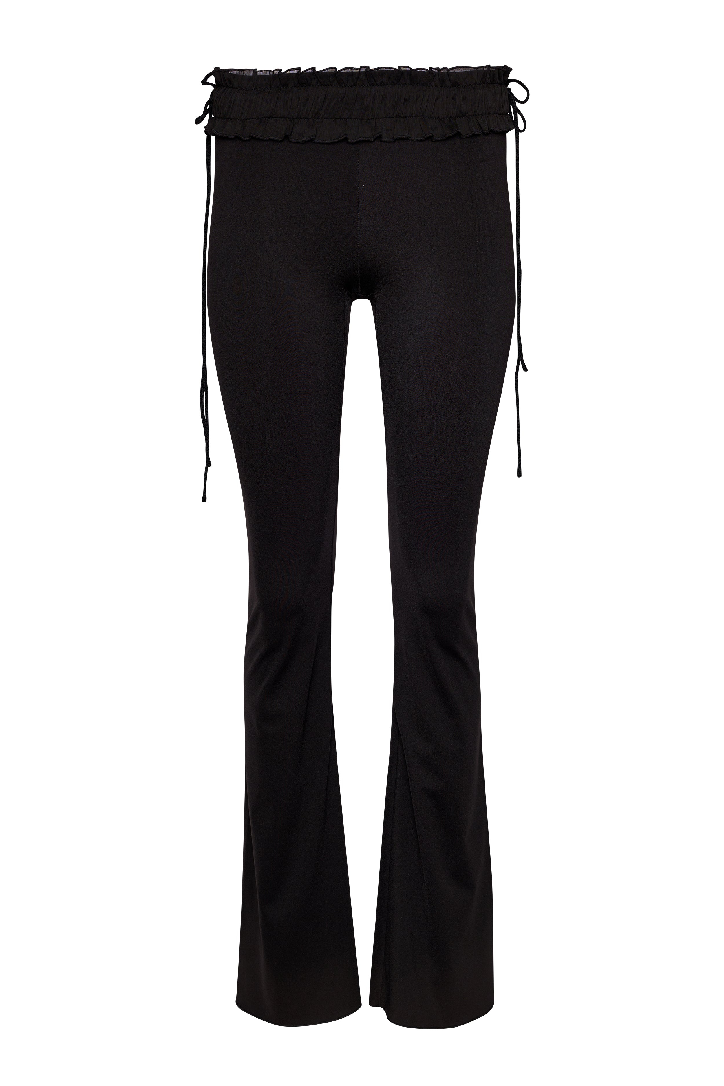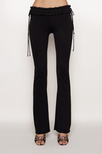 We made the perfect pants: lightweight stretch athletic-style jersey that’s super soft and comfortable in a cutie low-rise silhouette with a ruffled chiffon waist. They’re pretty great worn with anything, but we especially love them with the Ruched Chiffon Knit Tank. - Elasticized waistband - Pull-on style - Decorative side ties - 75% Nylon, 25% Spandex - Model wears a size small - Model measurements: Height 5’10”, Bust 31”, Waist 24”, Hips 34.5”
