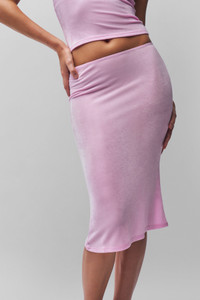 - Introducing the Selene Midi Skirt, created from our new spandex blend fabric with an elegant sheen. This midi skirt offers a low rise and elastic waistline for comfortable wear. An effortless staple to elevate your wardrobe effortlessly. - Composition: 95% Polyester, 5% Spandex - Ainhoa is wearing a size S and is 5'9½" with a 34" bust, 34½" hips, and 24" waist