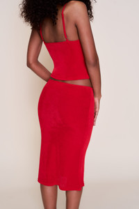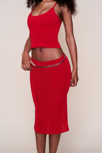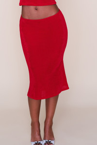 - Introducing the Selene Midi Skirt, created from our new spandex blend fabric with an elegant sheen. This midi skirt offers a low rise and elastic waistline for comfortable wear. An effortless staple to elevate your wardrobe effortlessly. - Composition: 95% Polyester, 5% Spandex - Eileen is wearing a size S and is 5'9" with a 32" bust, 35" hips, and 25.5" waist