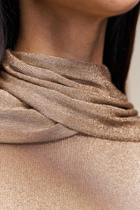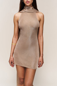 - A sleeveless mini dress with an attached scarf that can be styled multiple ways—draped, tied, or wrapped to your liking. Crafted from a metallic stretch knit that glimmers under the light and molds softly to the body. Minimal yet striking—made for evening moments. - Composition: 72% Viscose, 28% Metallic - Sonali is wearing a size S and is 5'10" with a 31" bust, 35" hips, and 23" waist