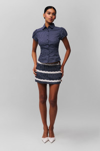 - Introducing the Simone Mini Skirt - paired perfectly with our Liana Top. Features side bows, lace details, and a zipper closure. - Fabrication: 98% Cotton, 2% Spandex - Birta is wearing a size S and is 5'9" with a 33" bust, 38" hips, and 23" waist