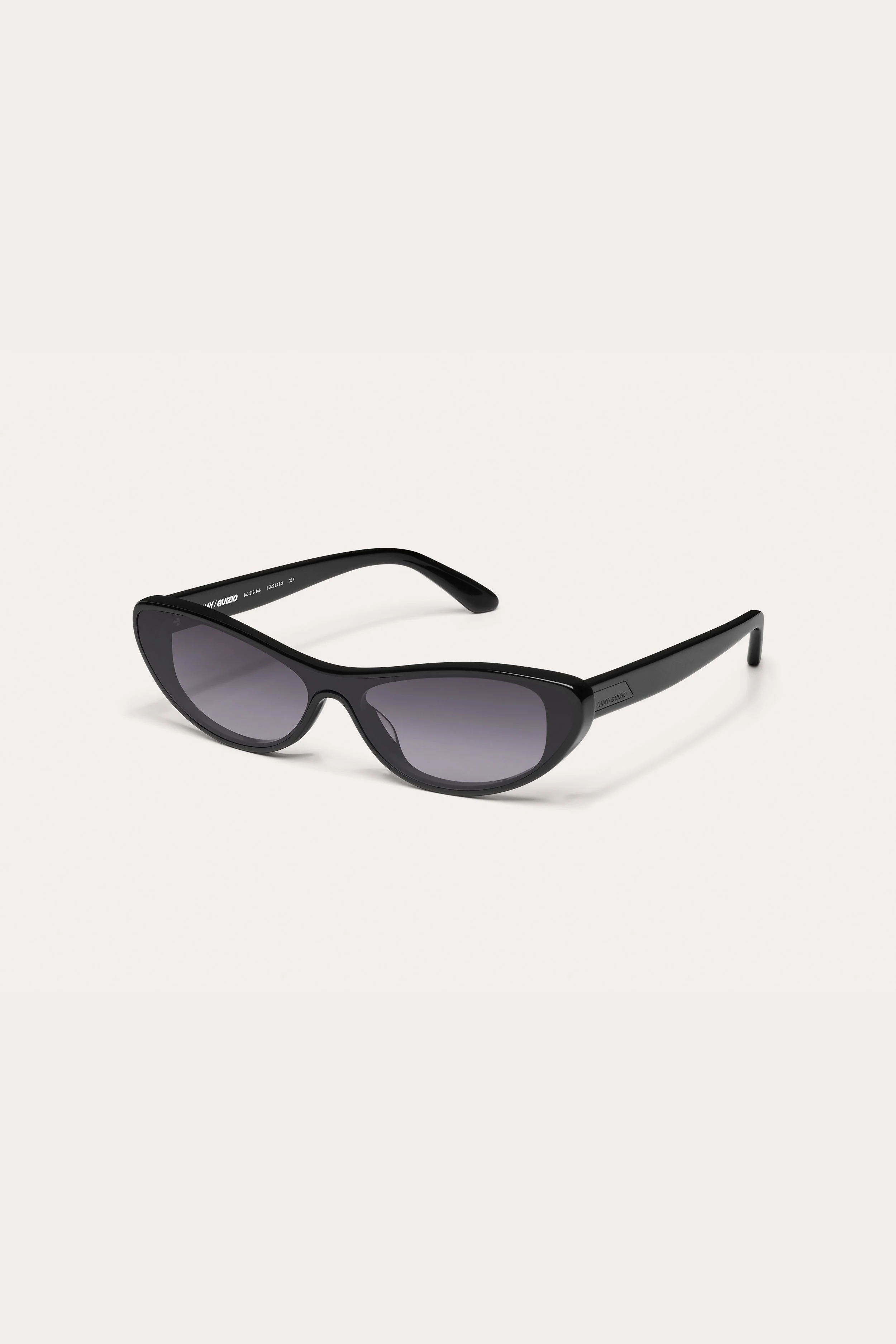 Anything goes in SLATE. This sleek and smooth cat eye embodies sensual sophistication. This collaboration is excluded from all discounts and is final sale - Lens: Gradient one piece lenses - Frame: Narrow cat eye shape - Arms: Sleek acetate arms - Details: Acetate frame with metal logo detail - Nose Bridge Fit: Built in universal nose pads - Case and cloth included
