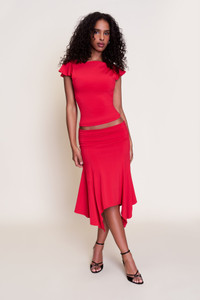- Pull-on skirt with an elasticized waistline, a cascading front, and a low, hip-hugging fit. - Composition: 92% Polyester, 8% Spandex - Birta is wearing a size XS and is 5'9" with a 33" bust, 38" hips, and 23" waist