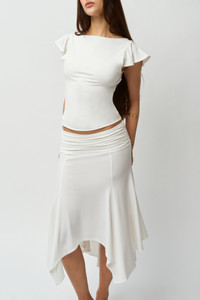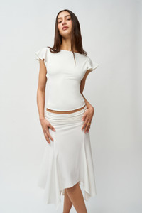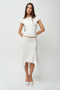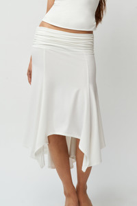 - Pull-on skirt with an elasticized waistline, a cascading front, and a low, hip-hugging fit. - Composition: 92% Polyester, 8% Spandex - Sonali is wearing a size S and is 5'10" with a 31" bust, 35" hips, and 23" waist