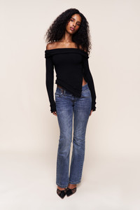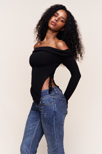 - The Soler Fold Over Knit Top is designed with an off-shoulder neckline and fold-over detail for a sleek, feminine silhouette. Crafted in a soft stretch knit, it features an asymmetrical hem with exposed seam accents and side cut-out lace-up trim. - Composition: 10% Wool, 45% Nylon, 45% Viscose - Eileen is wearing a size S and is 5'9" with a 32" bust, 35" hips, and 25.5" waist