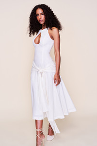 - Softly structured and effortlessly graceful, the Victoire Dress is crafted from a breezy linen blend that shapes the body with ease. A sweeping keyhole cutout adds drama to the neckline, while a draped sash detail at the waist creates movement and charm. The lace-up back offers an adjustable fit and a touch of romance. Finished with a flared, midi-length skirt, it’s a dress made for slow days and long evenings. - Composition: 55% Linen, 45% Rayon - Eileen is wearing a size S and is 5'9" with a 32" bust, 35" hips, and 25.5" waist