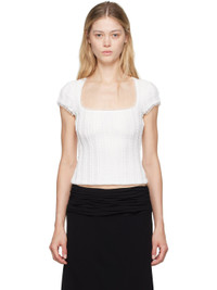 Knit stretch polyester T-shirt. Pinched seams throughout. · Ruffled lace trim at square neck and cuffs · Full stretch nylon mesh lining Supplier color: White