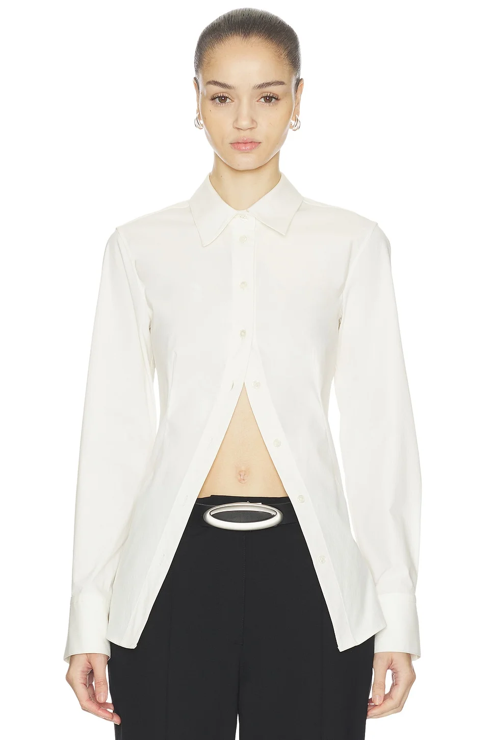 - This shirt is tailored to cinch in the back to create a dramatic cutaway silhouette in the front - It's crafted from a cotton-nylon blend that holds it's shape better than traditional cotton - .Imported - Poplin textile - Dry clean recommended - Front button closure - Back tie design - Button cuffs - Midweight poplin fabric - Revolve Style No. HELO-WS2 - Manufacturer Style No. HAS10020 H25