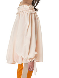 Haider Ackermann gathered blouse in pink, off-the-shoulder neckline, layered ruffles along top, ruched ruffles at unfinished cuffs with self-tie ribbons, straight hem, tonal stitching. Composition - 100% Silk Model is 5ft 10” and wearing a size 40. Bust: 32” Waist: 26” Hip: 31.5”