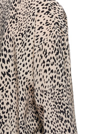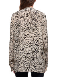Haider Ackermann oversized dali shirt in cream/black, all over printed graphic, rounded neckline, madarin/stand collar, concealed button placket, long sleeves, vented barrel cuffs with buttoned closure, elongated rear shirttail, straight/finished hem. Made in Slovenia. French Sizing. Composition - 100% Silk Model is 6ft and wearing a size 38. Bust: 32” Waist: 26” Hip: 35”