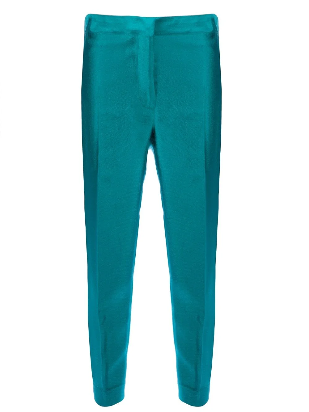 tapered leg Iridescent green silk trousers from Haider Ackermann featuring a tapered leg, front hidden fastening,belt loops, roll up hems and a rear slit pocket. Imported Composition Silk 100%