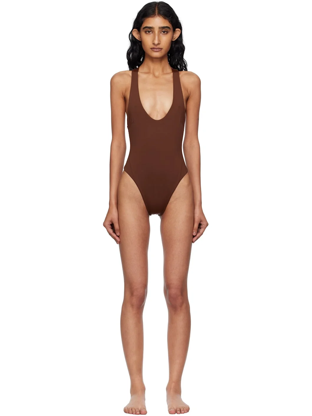 Stretch nylon jersey one-piece swimsuit. · OEKO-TEX®-certified · UPF 50+ protection · Scoop neck · Racer back · Fully lined Supplier color: Brauna brown 87% polyamide, 13% elastane. Made in Brazil 252207F103008