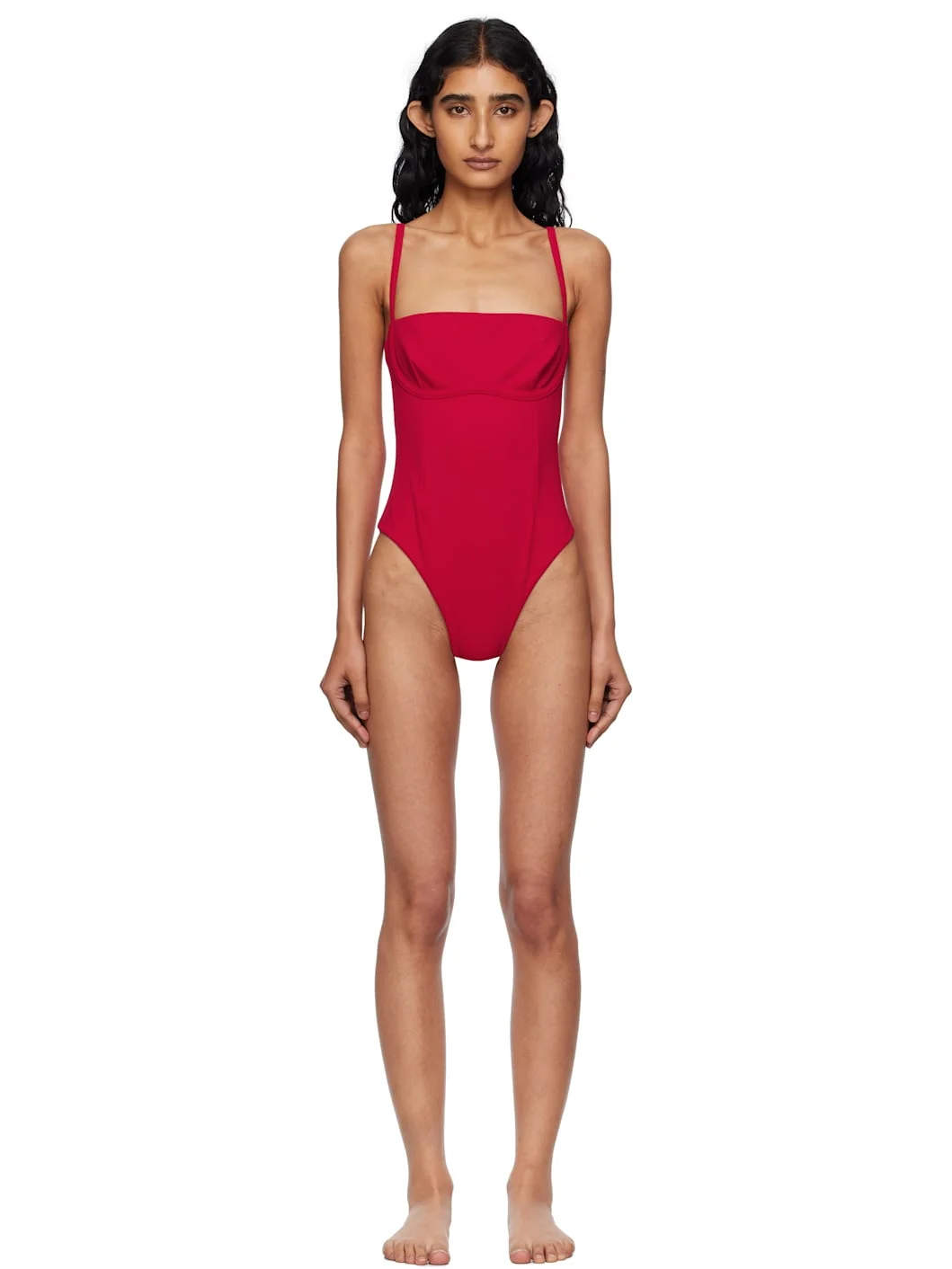 Stretch crepe one-piece swimsuit. · UPF 50+ protection · Square neck · Elasticized shoulder straps · Full stretch jersey lining Supplier color: Red Body: 96% polyester, 4% elastane. Lining: 87% polyamide, 13% elastane. Made in Brazil 252207F103011