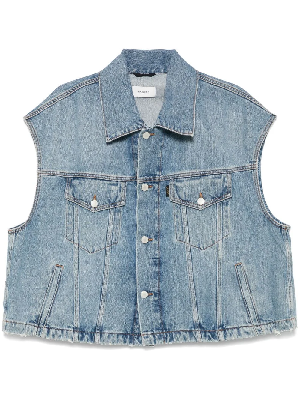 denim gilet Highlights - Indigo blue - Front button fastening - Two chest flap pockets - Two side welt pockets - Drop armholes Made in Italy Composition Cotton 100% SIZE & FIT Model measurements Height 5 ft 10 in(1.77 m) Bust/Chest 29.92 in(76 cm) Hips 34.25 in(87 cm) Waist 23.62 in(60 cm) FittingInformation Designed for a boxy fit, intended for a loose fit throughout Sturdy and hard-wearing, this denim piece offers no stretch