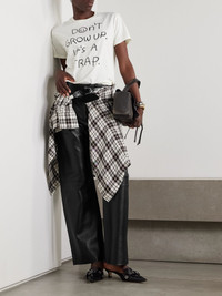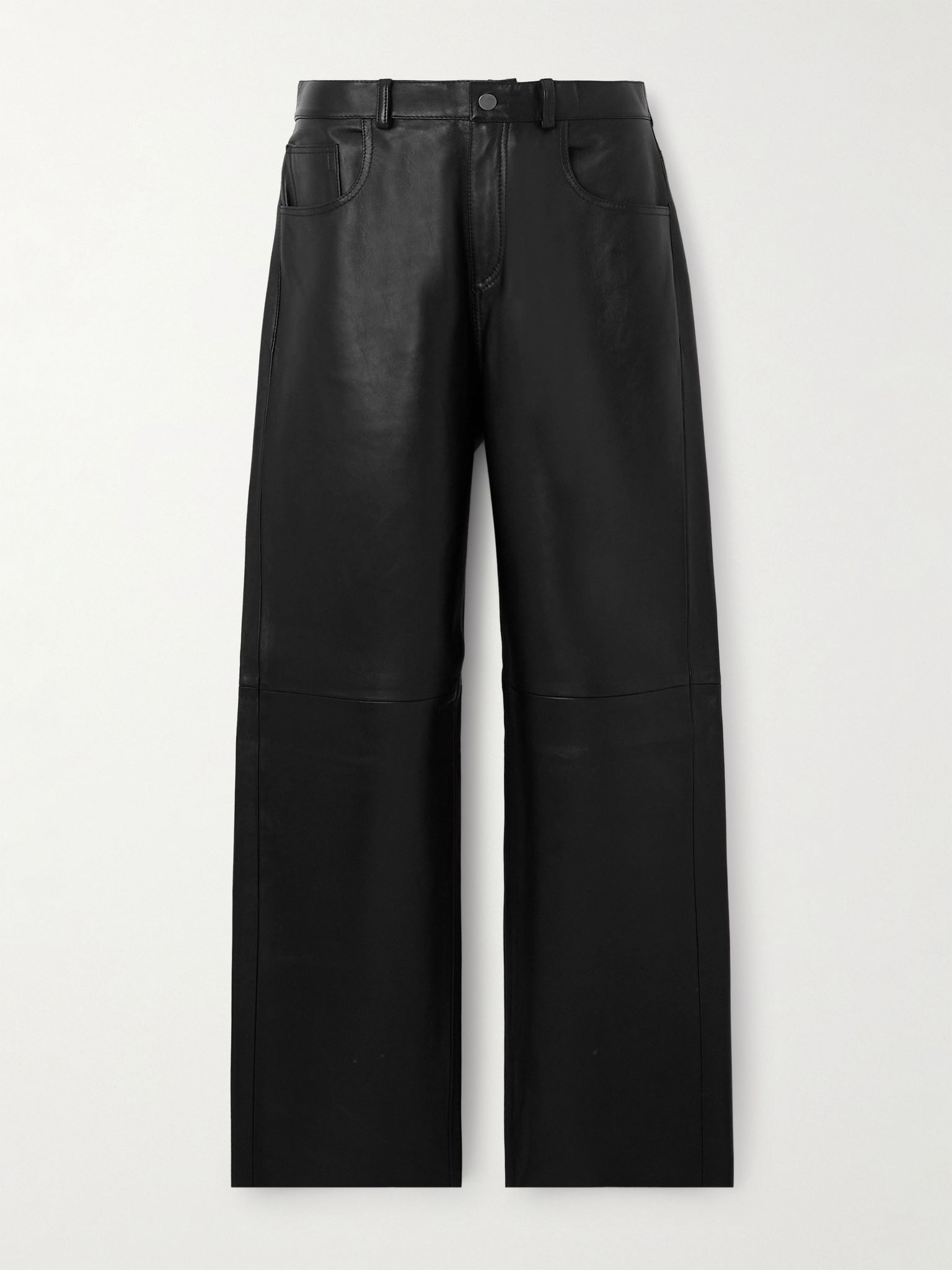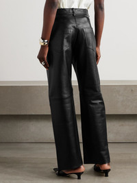 Haikure applies its expertise in jeans to these 'Bonnie' pants. Made from supple leather that only gets softer with wear, they have wide legs and a five-pocket construction. Style yours with a sheer blouse, bodysuit or collared shirt. Size & Fit - Fits true to size, take your normal size - Dropped crotch, designed for a relaxed fit - Supple, non-stretchy leather - Model is 177cm/ 5'10" and is wearing a size 26 Model measurements: - Bust: 80cm/ 31.5" - Waist: 60cm/ 23.5" - Hip: 89cm/ 35" Details & Care - Black leather - Snap and concealed zip fastening at front - 100% leather (Lamb) - Specialist clean