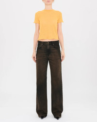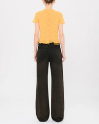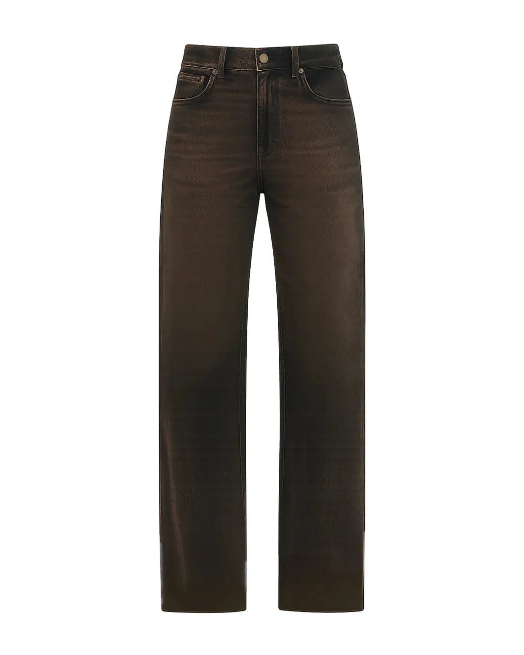 The Korea Jeans in Brown Black by Haikure are mid-rise, straight fit trousers with a wide-leg silhouette. - 100% Cotton - Medium Waist Band - Five pockets - Model is wearing a size 26 - HEW03185DF144L087