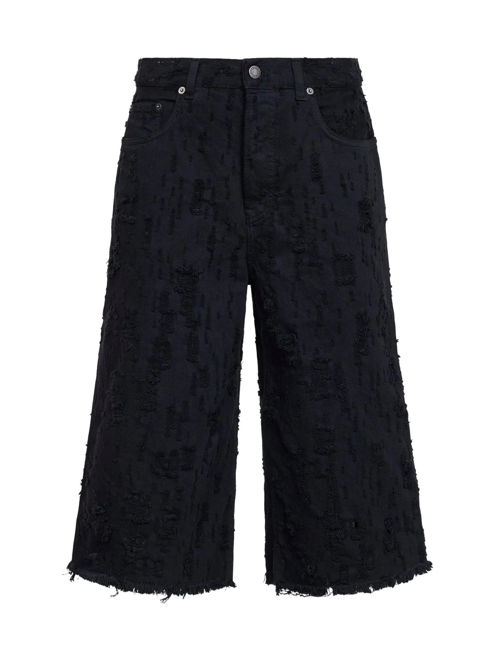 - Covered front closure, metal logo button - Waist with belt loops - Five-pocket model - Embossed-logo patch at back waistband - Frayed hems - Carbon wash with all-over distressed details and rips - Black color - 100% cotton - Made in italy Natural (Veg): Cotton100 % Made in: Italy Season: P26 HEW03369GF180T0491