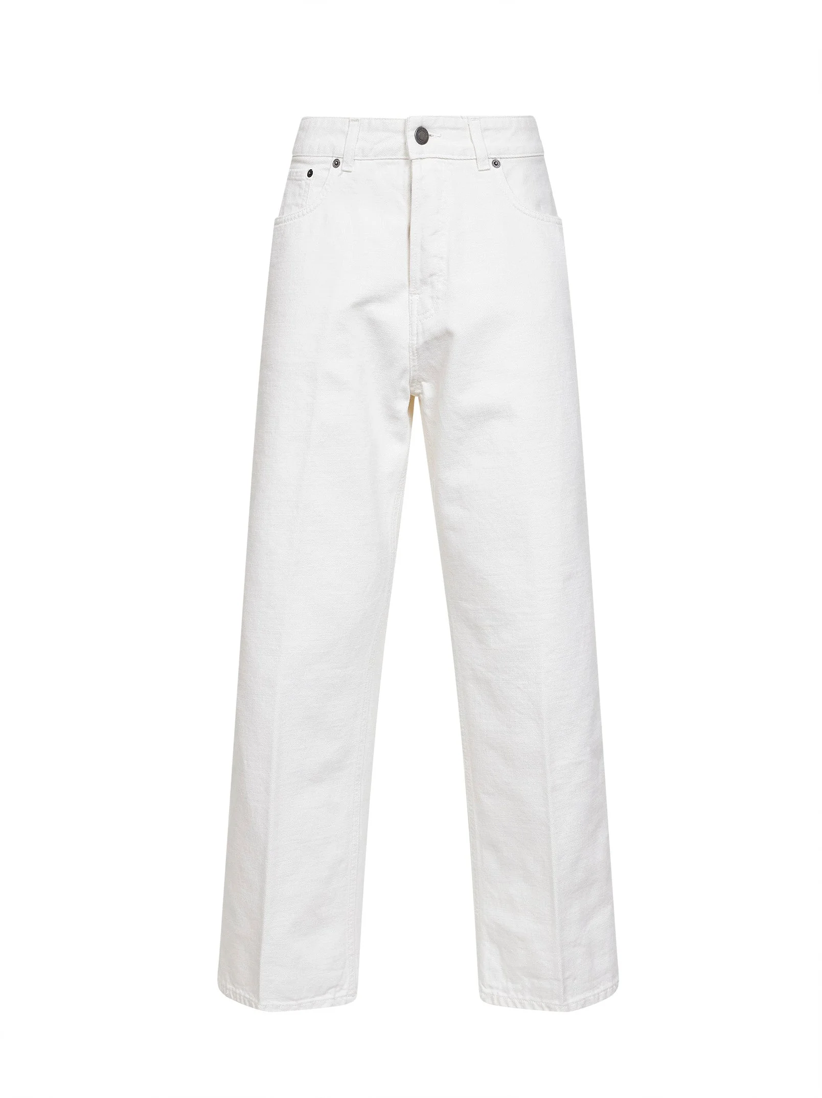 - Covered front closure, metal logo button - High-rise waist with belt loops - Five-pocket model - Embossed-logo patch at back waistband - Straight leg - Cropped ankle length - Off white color - 100% cotton - Made in italy Natural (Veg): Cotton100 % Made in: Italy Season: P26 HEW03297GF172PXT0341