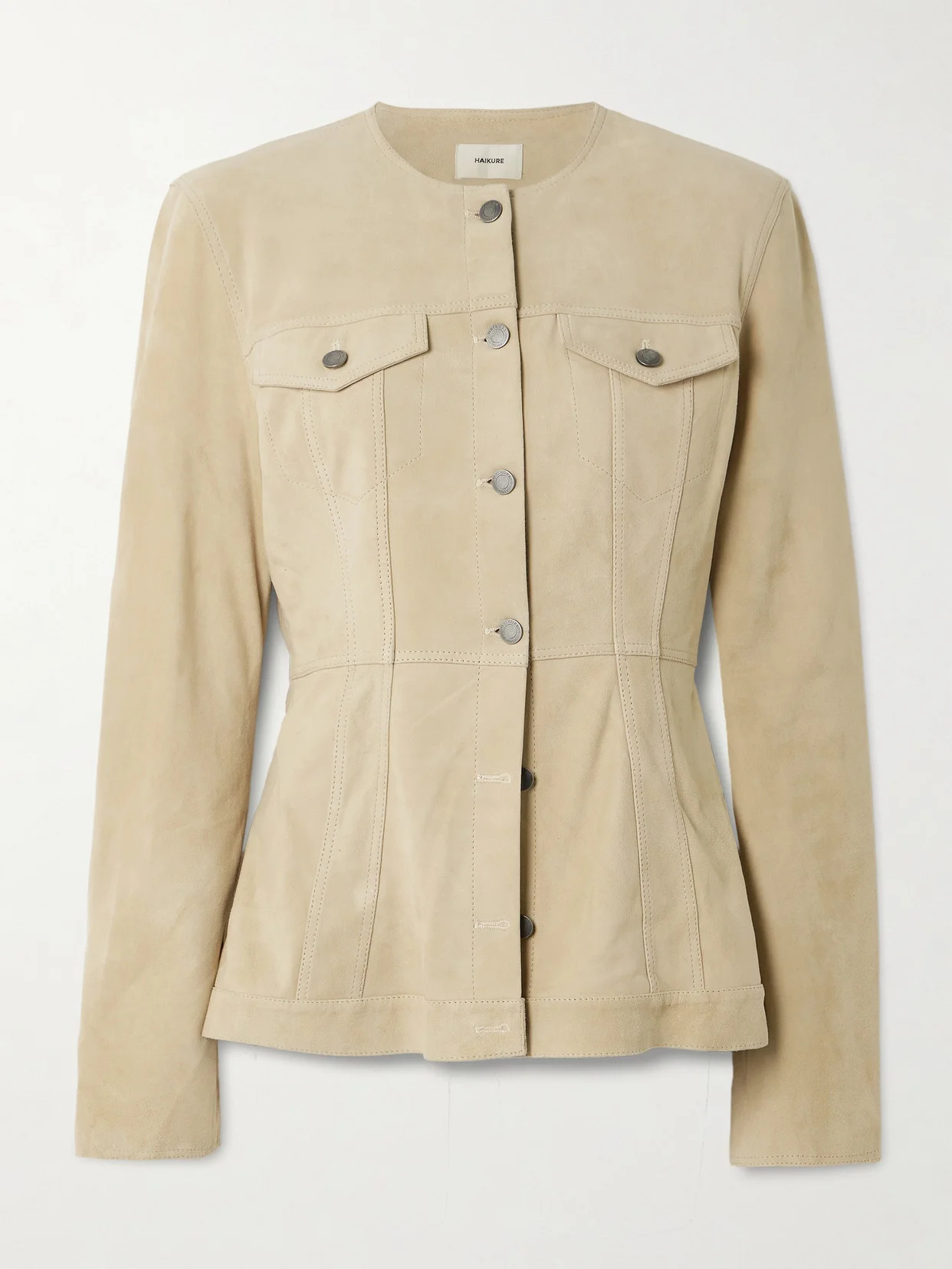 Haikure's 'Temple' jacket pairs effortlessly with the matching 'Korea' pants in our edit. Made from panels of butter-soft suede, it has a collarless neckline and nips in at the waist to create an hourglass shape.