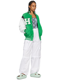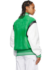 Suede and grained leather bomber jacket. · Paneled construction · Rib knit stand collar, hem, and cuffs · Press-stud closure · Chenille logo patch at chest · Welt pockets · Dropped shoulders · Full satin lining Supplier color: Green/White/Black Body: 100% leather. Trim: 96% cotton, 2% polyamide, 2% elastane. Lining: 100% viscose. Made in Italy 231242F063000