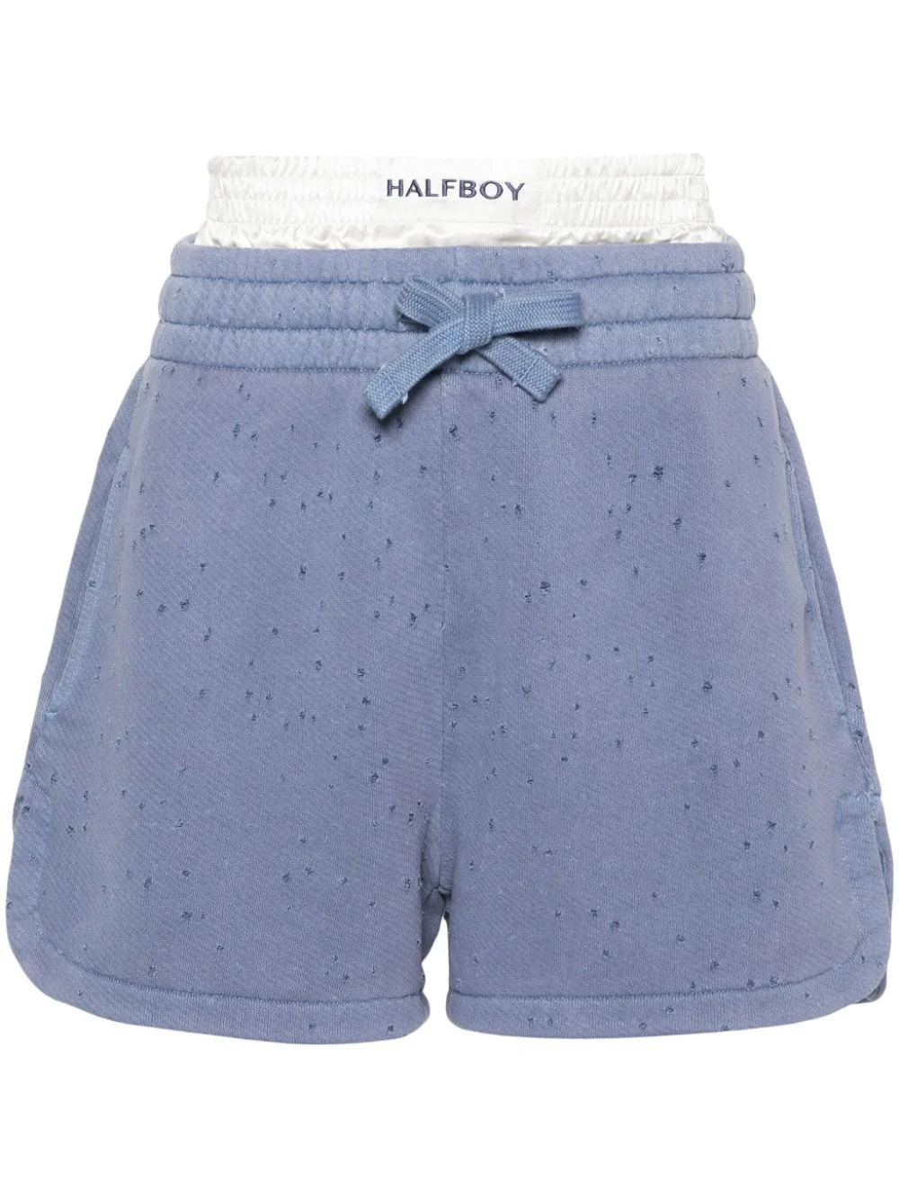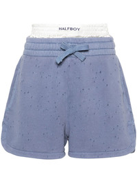 layered distressed cotton shorts Highlights - White/blue tint - Cotton - Silk panelling - Distressed finish - Layered design - Elasticated waistband with embroidered logo - Two side inset pockets - Drawstring fastening Imported Composition Cotton 100%, Silk 100% SIZE & FIT Model measurements Height 5 ft 11 in(1.8 m) Bust/Chest 33.07 in(84 cm) Hips 37 in(94 cm) Waist 25.59 in(65 cm) FittingInformation Designed for a loose fit, offering comfort and movement when worn The elasticated waist allows for a comfortable fit Made from a midweight non-stretch fabric, this piece offers minimal elasticity when worn This piece fits true to size – take your usual size