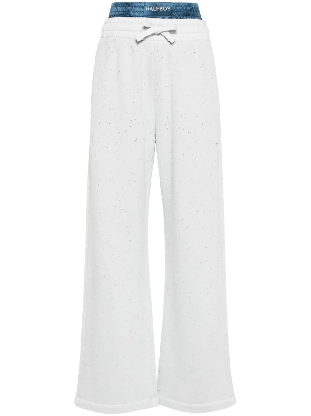 layered straight-leg track pants Highlights - Ash grey/cerulean blue - Cotton - Jersey texture - Distressed finish - Layered design - Straight leg - Elasticated waistband with embroidered logo - Two side inset pockets - Drawstring fastening Imported Composition Cotton 100%, Silk 100% SIZE & FIT Model measurements Height 5 ft 11 in(1.8 m) Bust/Chest 33.07 in(84 cm) Hips 37 in(94 cm) Waist 25.59 in(65 cm) FittingInformation Designed for a straight-leg fit, these trousers allow for a close fit at the waist and an unrestricted, comfortable fit over the leg The elasticated waist allows for a comfortable fit Made from a midweight non-stretch fabric, this piece offers minimal elasticity when worn This piece fits true to size – take your usual size
