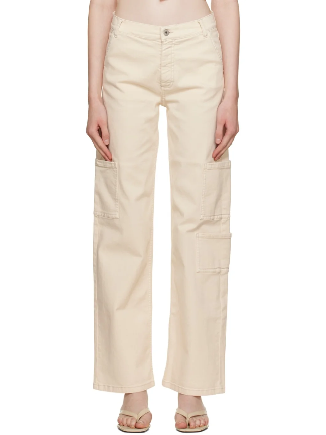 Stretch cotton-blend twill trousers in off-white. · Belt loops · Four-pocket styling · Zip-fly · Hammer loop at outseam · Patch pocket at outseams · Leather logo patch at back waistband Supplier color: Cream 93% cotton, 5% elastomultiester, 2% elastane. Made in Italy 222242F087000