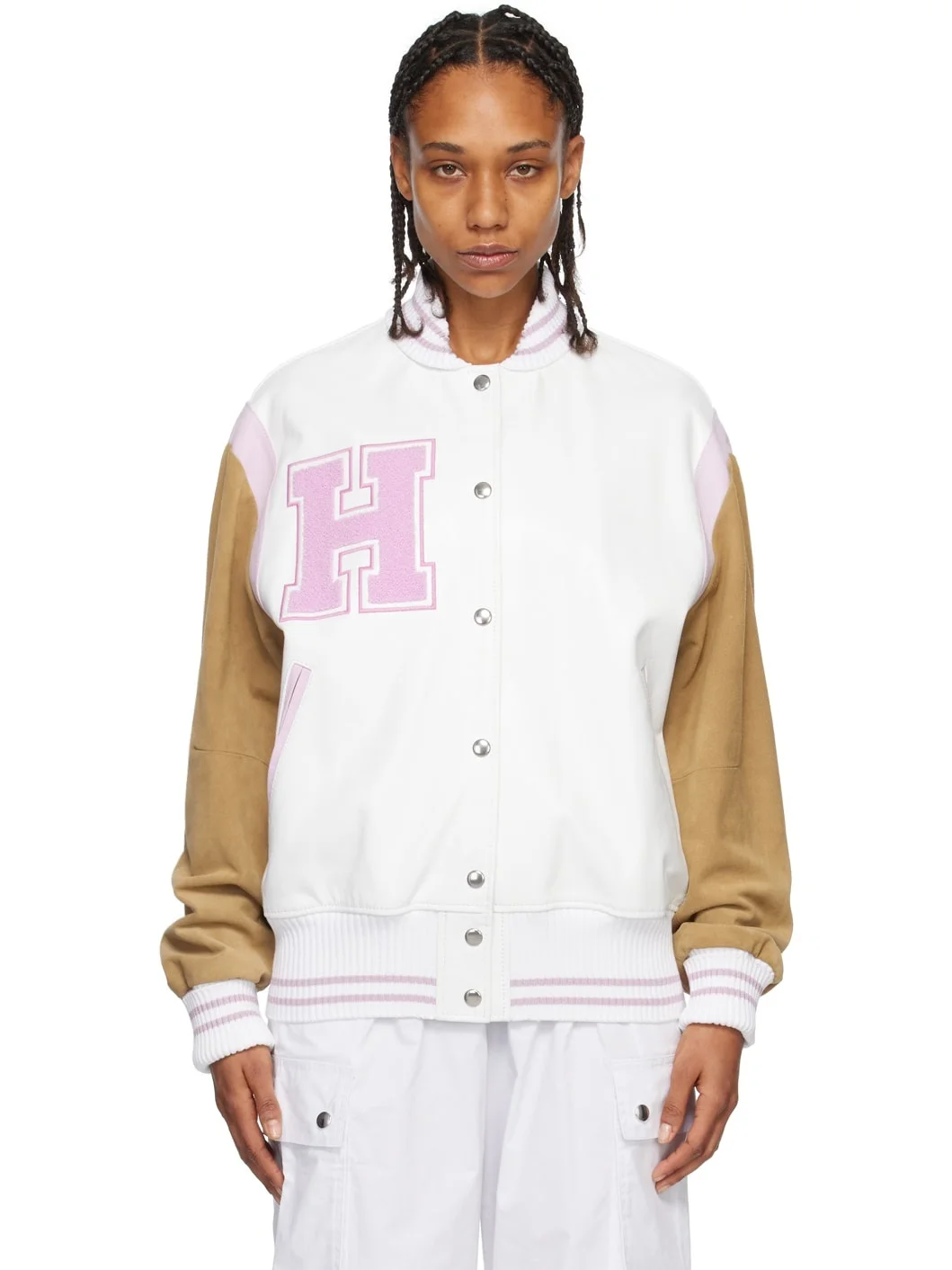 Grained leather and suede bomber jacket. · Paneled construction · Rib knit stand collar, hem, and cuffs · Press-stud closure · Chenille logo patch at chest · Welt pockets · Dropped shoulders · Full satin lining Supplier color: White/Camel/Pink Body: 100% leather. Trim: 96% cotton, 2% polyamide, 2% elastane. Lining: 100% viscose. Made in Italy 231242F063001