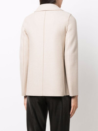 double-breasted fitted jacket beige virgin wool slim cut double-breasted button fastening classic lapels long sleeves two side slit pockets Made in Italy Composition Virgin Wool 100% SIZE & FIT Model measurements Height 5 ft 11 in(1.8 m) Bust/Chest 33.07 in(84 cm) Hips 37.4 in(95 cm) Waist 25.19 in(64 cm) FittingInformation This piece fits true to size. We recommend you get your regular size Cut for a loose fit Made with a mid-weight non-stretch fabric