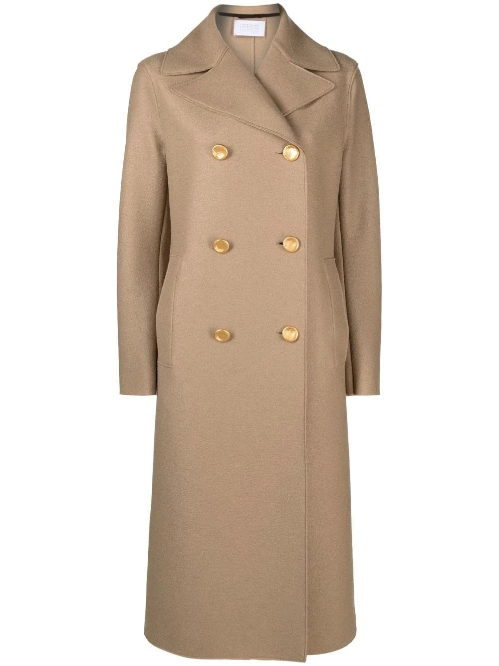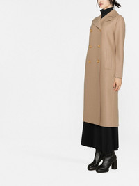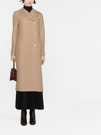 double-breasted virgin wool coat Highlights - Tan brown - Virgin wool - Tailored cut - Double-breasted button fastening - Gold-tone buttons - Notched lapels - Long sleeves - Straight hem - Two side welt pockets - Mid-calf length Made in Italy Composition Virgin Wool 100% SIZE & FIT Model measurements Height 5 ft 10 in(1.77 m) Bust/Chest 31.49 in(80 cm) Hips 35.03 in(89 cm) Waist 23.22 in(59 cm) FittingInformation This piece fits true to size. We recommend you get your regular size Cut for a loose fit Made with a mid-weight non-stretch fabric Washing instructions Dry Clean Only