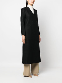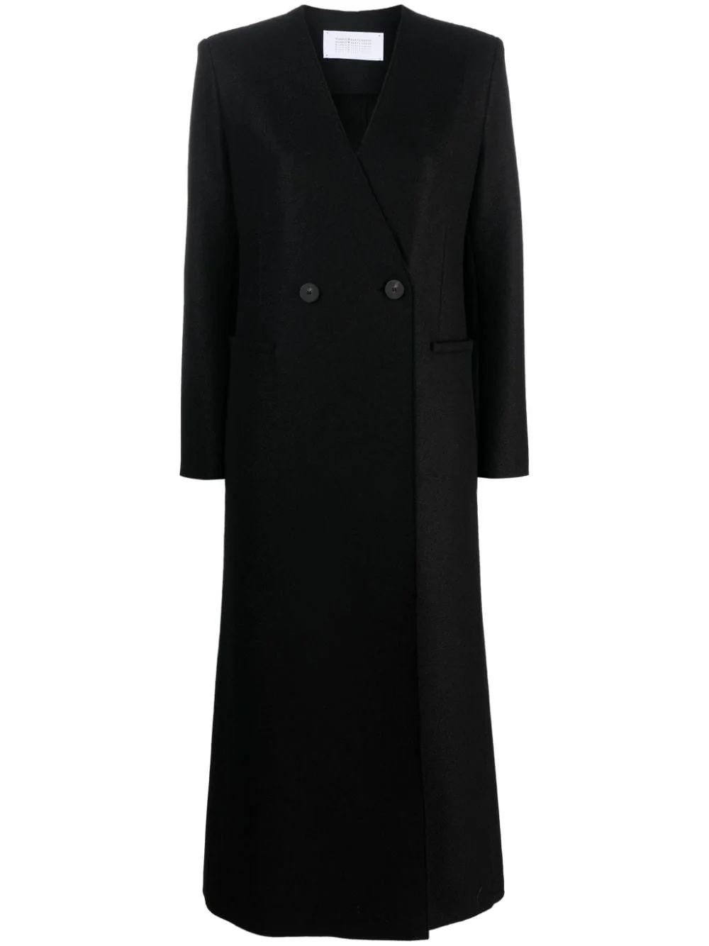 double-breasted wool coat Highlights - Core black - Wool - No lapels - Double-breasted button fastening - Long sleeves - Buttoned cuffs - Two side welt pockets - Straight hem Imported Composition Wool 100% SIZE & FIT Model measurements Height 5 ft 10 in(1.78 m) Bust/Chest 30.7 in(78 cm) Hips 36.22 in(92 cm) Waist 25.59 in(65 cm) FittingInformation Designed for a slim fit that sits just away from the body offering a close yet comfortable fit The internal shoulder pads offer a structured shape Made from a midweight non-stretch fabric This piece fits true to size – take your usual size