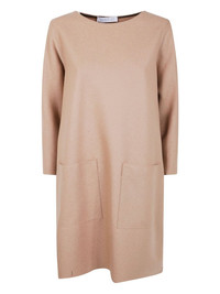 patch-pocket wool midi dress Highlights - Beige - Wool material - Three-quarter sleeves - Round neck - Patch pockets - Straight hemline Imported Composition Wool 100% Washing instructions Read Manufacturer Guidelines