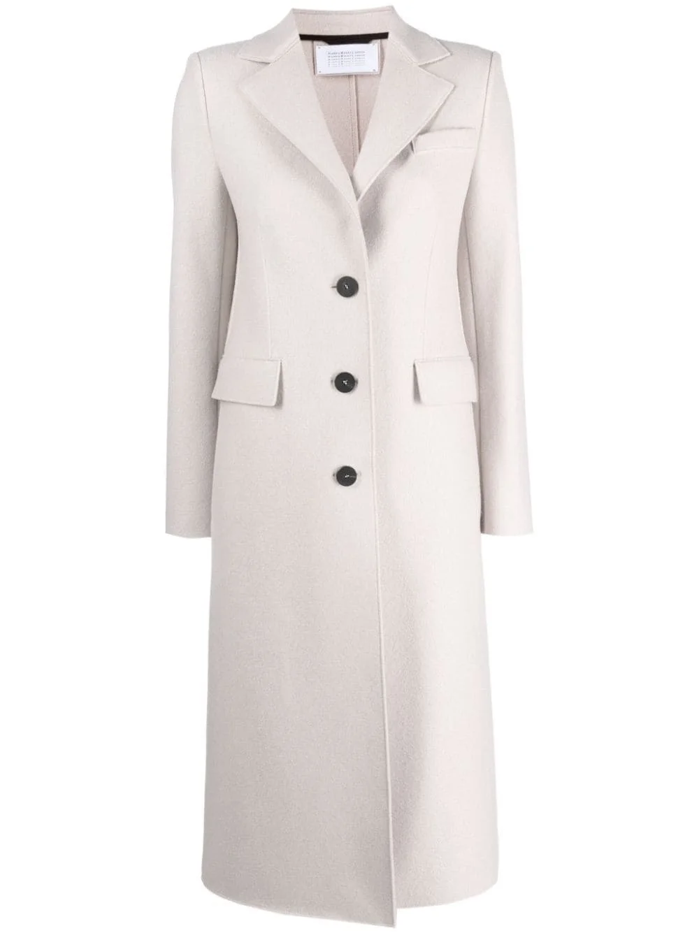 single-breasted virgin wool coat Highlights - Cream white - Virgin wool - Peak lapels - Front button fastening - Chest welt pocket - Two front flap pockets - Long sleeves - American rear vent - Straight hem - Mid-length Made in Italy Composition Virgin Wool 100% SIZE & FIT Model measurements Height 5 ft 10 in(1.78 m) Bust/Chest 31.49 in(80 cm) Hips 36.22 in(92 cm) Waist 25.59 in(65 cm) FittingInformation Designed for a slim fit that sits just away from the body offering a close yet comfortable fit The internal shoulder pads offer a structured shape Made from a midweight non-stretch fabric This piece fits true to size – take your usual size