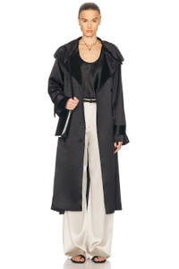 Details - 100% silk - Made in USA - Dry clean only - Front double-breasted button closure - Epaulettes and belted cuffs - Side seam pockets - Optional belt - Satin fabric with side slits - Our Style No. HIRF-WO4 - Manufacturer Style No. HL-VII-0207