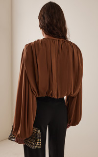 Each Heirlome piece is crafted through the lens of timeless artisanal practices, naturally resulting in impeccable tailoring and exquisite details. Michelle is a long sleeved top in shirred silk double georgette fabric. Shirred fabric is attached to lining at hem creating a subtle bubble with a soft drape. Other details include center back keyhole with button for closure and elasticated cuffs at sleeves. PRODUCT DETAILS - Fall '25 - Button fastening - Composition: 100% silk - Designer color: Sepia - Dry clean - Imported
