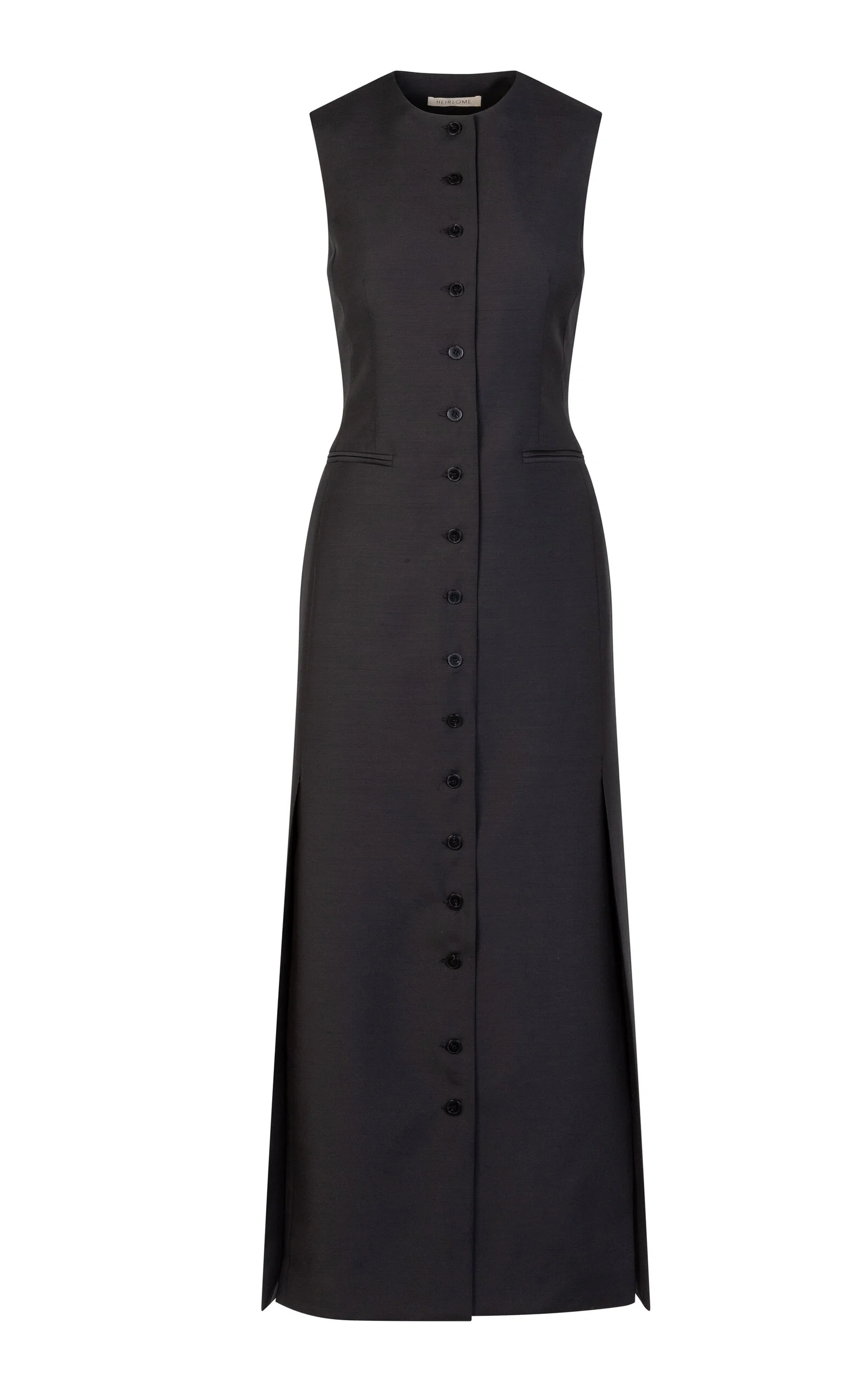 PRODUCT DETAILS - Slim fit, sleeveless, crew neck, pleated split hem - Button fastening - Lined - Composition: 32% Silk 68% Wool - Color: black - Dry clean only - Fall '25