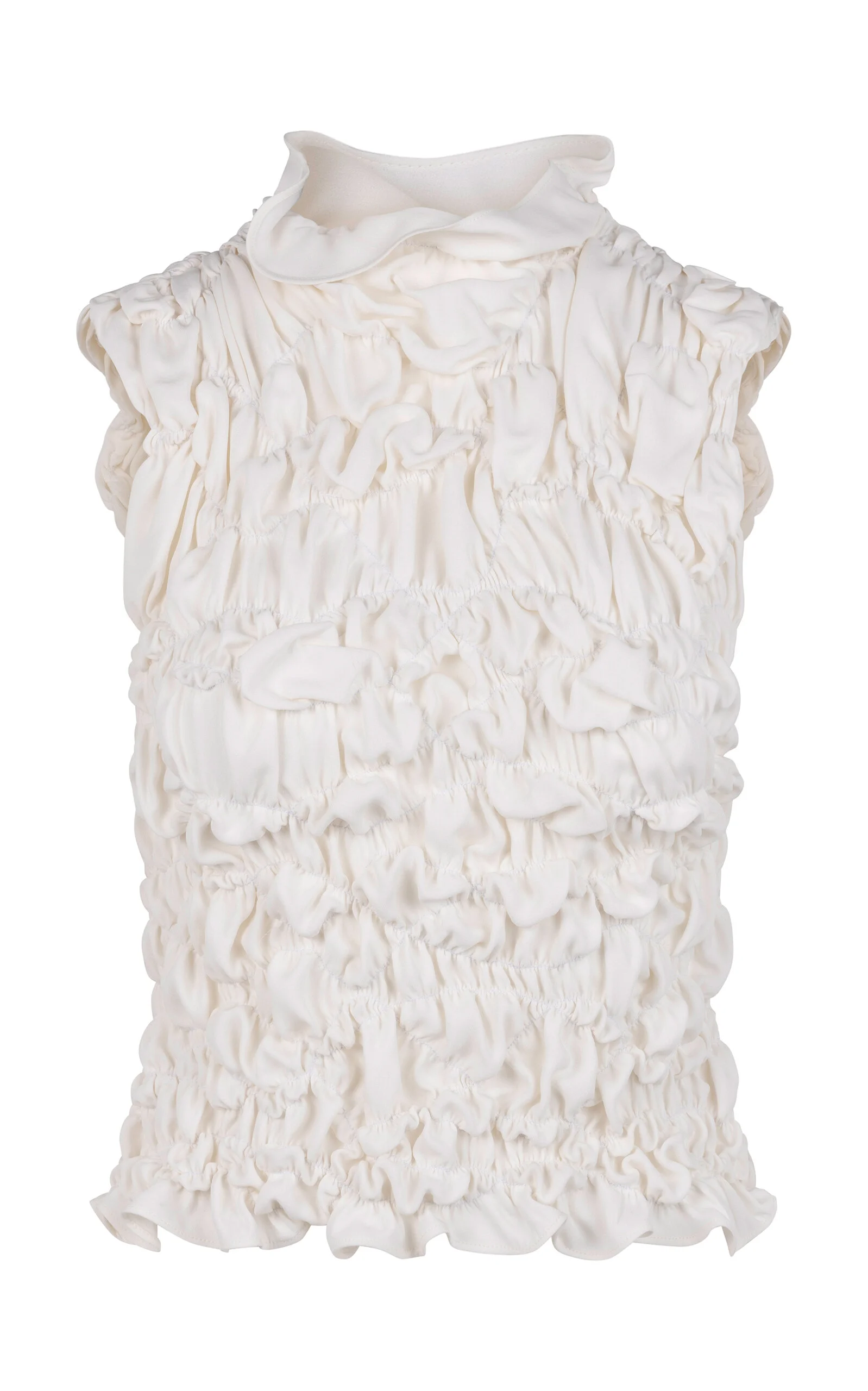 PRODUCT DETAILS - Slim fit, sleeveless silhouette, high neckline with soft drape detail, ruched and gathered texture throughout - Slip on - Unlined - Composition: 100% SILK - Color: ivory - *Dry Clean Only - Spring Summer 2026