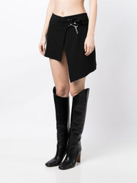 asymmetric wrap miniskirt Highlights - Jet black - Stretch-design - Wrap design - Silver-tone logo plaque - Press-stud fastening - Asymmetric hem - Side slit - Thigh-length Imported Composition Viscose 62%, Nylon 33%, Elastane 5% SIZE & FIT Model measurements Height 5 ft 9 in(1.76 m) Bust/Chest 31.1 in(79 cm) Hips 35.03 in(89 cm) Waist 24.4 in(62 cm) FittingInformation Designed with an asymmetric hem, this skirt is intended to be worn low on the hips Slightly short in length; consider your own measurements Made from a midweight stretch fabric, this piece offers elasticity and flexibility when worn This piece fits large – take one size down Washing instructions Hand Wash