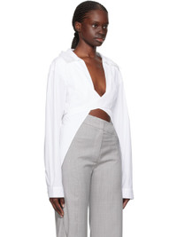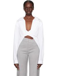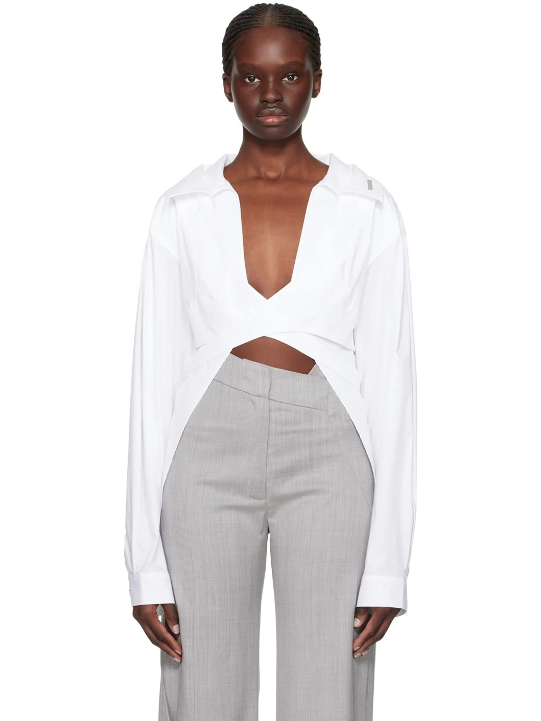 Stretch organic cotton poplin shirt. · Layered construction · Logo hardware at open double spread collar · Plunging V-neck · Concealed G-hook fastening at front · Two-button barrel cuffs · Wraparound press-stud straps at waist · Vent at back hem Supplier color: White