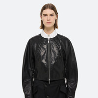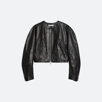 Collarless leather jacket with exaggerated sleeves. Inspired by vintage parachute designs, with articulated seams that create a rounded shoulder and a fitted waist. Fits true to size. Model is 5’10” and wears size S. DETAILS - Waxed cowhide leather - 2-way zipper closure - Adjustable snap closure at wrists - Cropped length - Fitted at waist - Fully lined - Metal logo plate at back - P01HW102 MATERIALS & CARE - Composition: 100% cowhide leather; lining: 100% viscose - Professional leather clean only - Finished Garment Manufacturing Country/Region: India - Fabric Production Country/Region: India