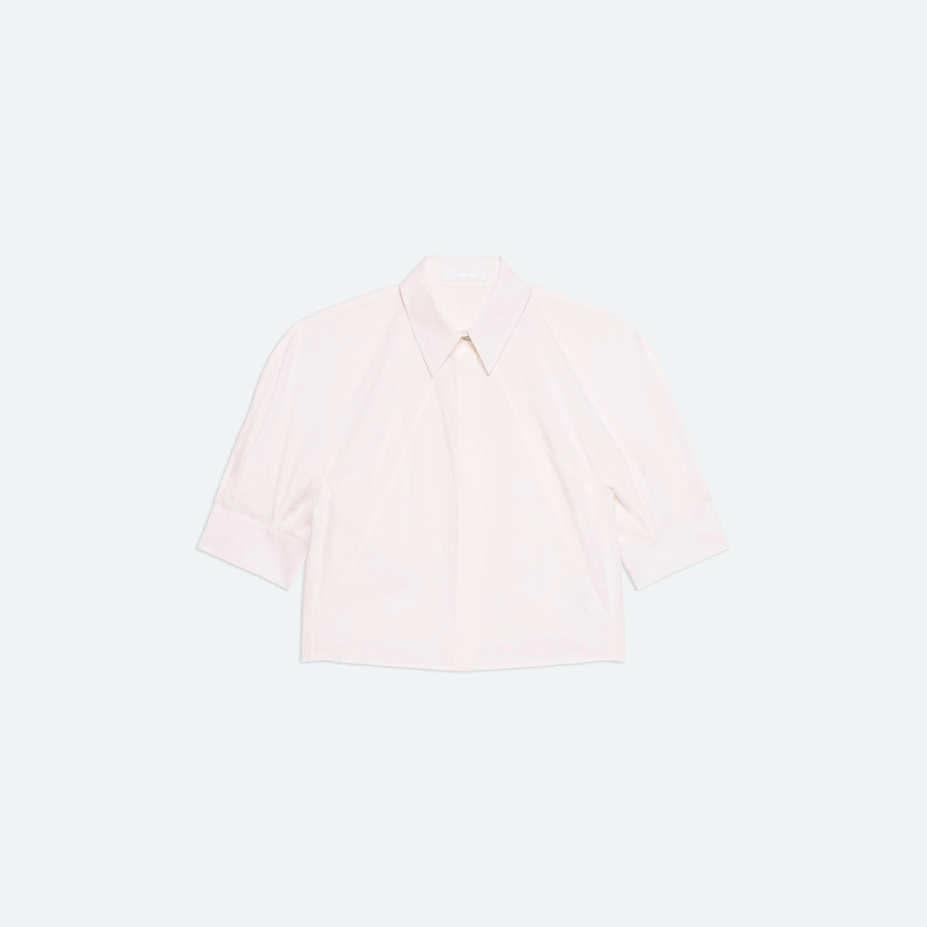 Cotton poplin shirt with exaggerated sleeves. Inspired by vintage parachute designs, with articulated seams that create a rounded shoulder and a fitted waist. Fits true to size. Model is 5’11” and wears size S. DETAILS - Pointed collar - Elbow-length sleeves - Cropped length - Hidden button front closure - Metal-wrapped logo buttons - Tonal rubber logo patch at back - P01HW504 MATERIALS & CARE - Composition: 100% Cotton - Professional dry clean only - Finished Garment Manufacturing Country/Region: Vietnam - Fabric Production Country/Region: Japan - Weaving Country/Region: (of fabric) Japan - Dyeing Country/Region: (of fabric) Japan - Finishing Country/Region: (of fabric) Japan