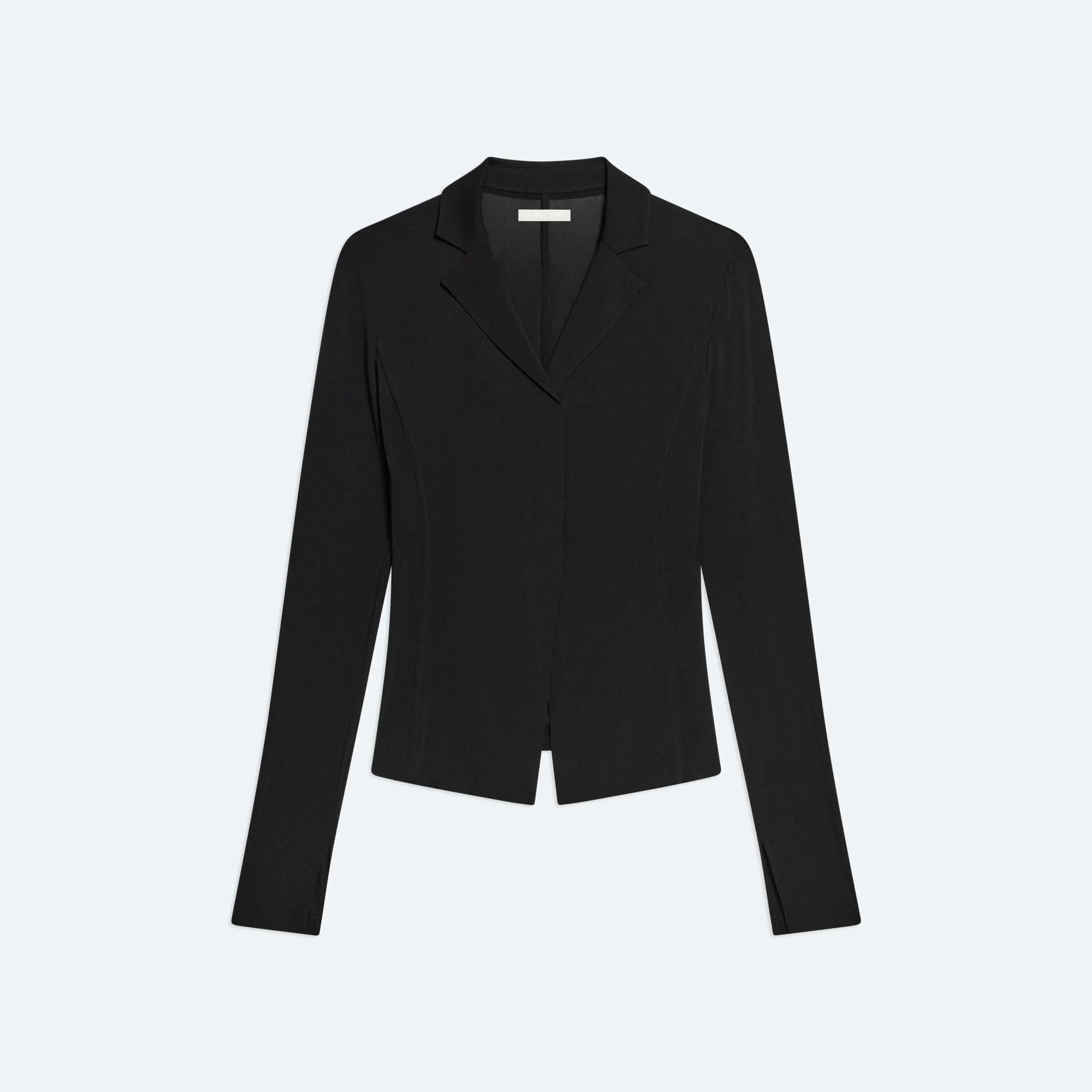 Long-sleeved top in fluid viscose with notched lapels. Fits true to size. Model is 5'11" and wears size S. DETAILS - Notched lapels - Layered front seam with high slit - Slit on sleeves - Slim fit - P10HW502 MATERIALS & CARE - Composition: 95% viscose, 5% elastane - Dry clean with any solvent except trichloroethylene. - Fabric Production Country/Region: China - Weaving Country/Region: (of fabric) China - Dyeing Country/Region: (of fabric) China - Finishing Country/Region: (of fabric) China