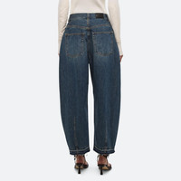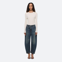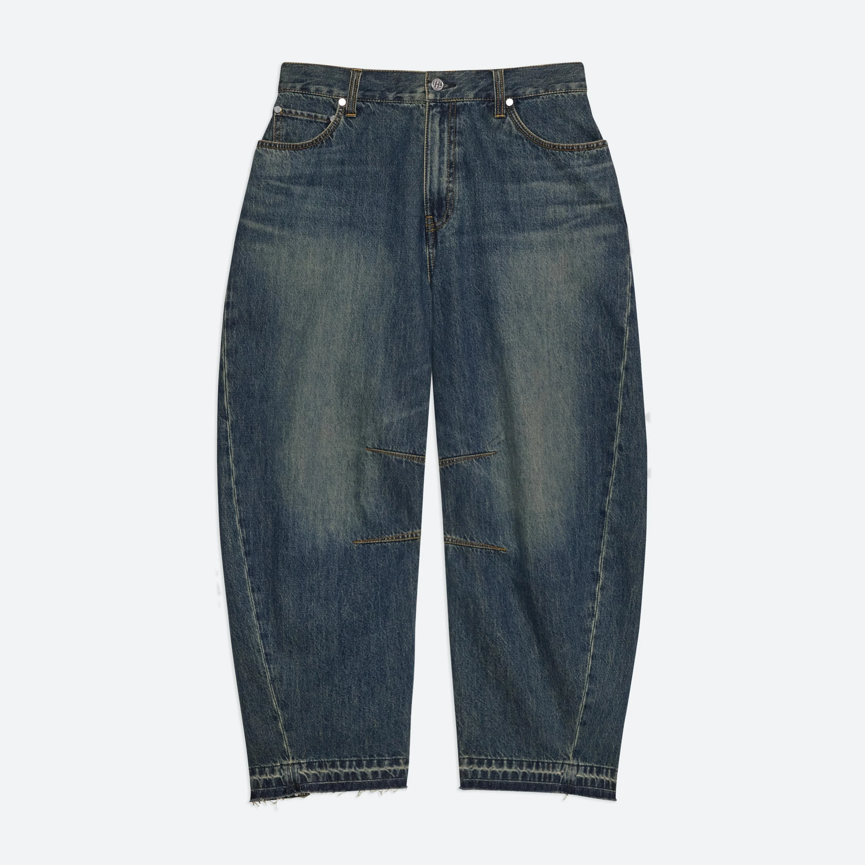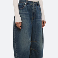 Barrel-leg jeans in vintage wash with released hem. Darts at the knee and ankle sculpt a round, curved leg shape. Fits true to size. Model is 5’10” and wears size 26. DETAILS - Mid-rise - Barrel-shaped leg - Released hem detail with raw edge effect - Zip fly with button closure - Classic five-pocket style - Black leather logo patch - Cropped ankle length - 26 ½” inseam and 18” leg opening - P05DW201 MATERIALS & CARE - Composition: 100% cotton - Machine wash cold on gentle cycle with like colors, inside-out. Do not bleach. Hang to dry in shade. Cool iron if needed. Dry clean with any solvent except trichloroethylene. - Finished Garment Manufacturing Country/Region: China - Fabric Production Country/Region: Italy - Weaving Country/Region: (of fabric) Italy - Dyeing Country/Region: (of fabric) Italy - Finishing Country/Region: (of fabric) Italy