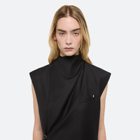 Tailored blazer dress in stretch wool suiting. Wear buttoned at the neck or open to reveal a draped cowl neckline in fluid silk. Fits true to size. Model is 5’10” and wears size S. DETAILS - Adjustable cowl neckline - Wrap construction with button closure and waist tie - Waist flap pockets and on-seam side pockets - Welt pocket with metal logo clip - Metal-wrapped logo buttons - Fully lined - P04HW603 MATERIALS & CARE - Composition: 100% wool; lining: 100% viscose - Do not wash. Do not bleach. Do not tumble dry. Cool iron if needed. Professional dry clean with petroleum solvent only. - Finished Garment Manufacturing Country/Region: China - Fabric Production Country/Region: China - Weaving Country/Region: (of fabric) China - Dyeing Country/Region: (of fabric) China - Finishing Country/Region: (of fabric) China