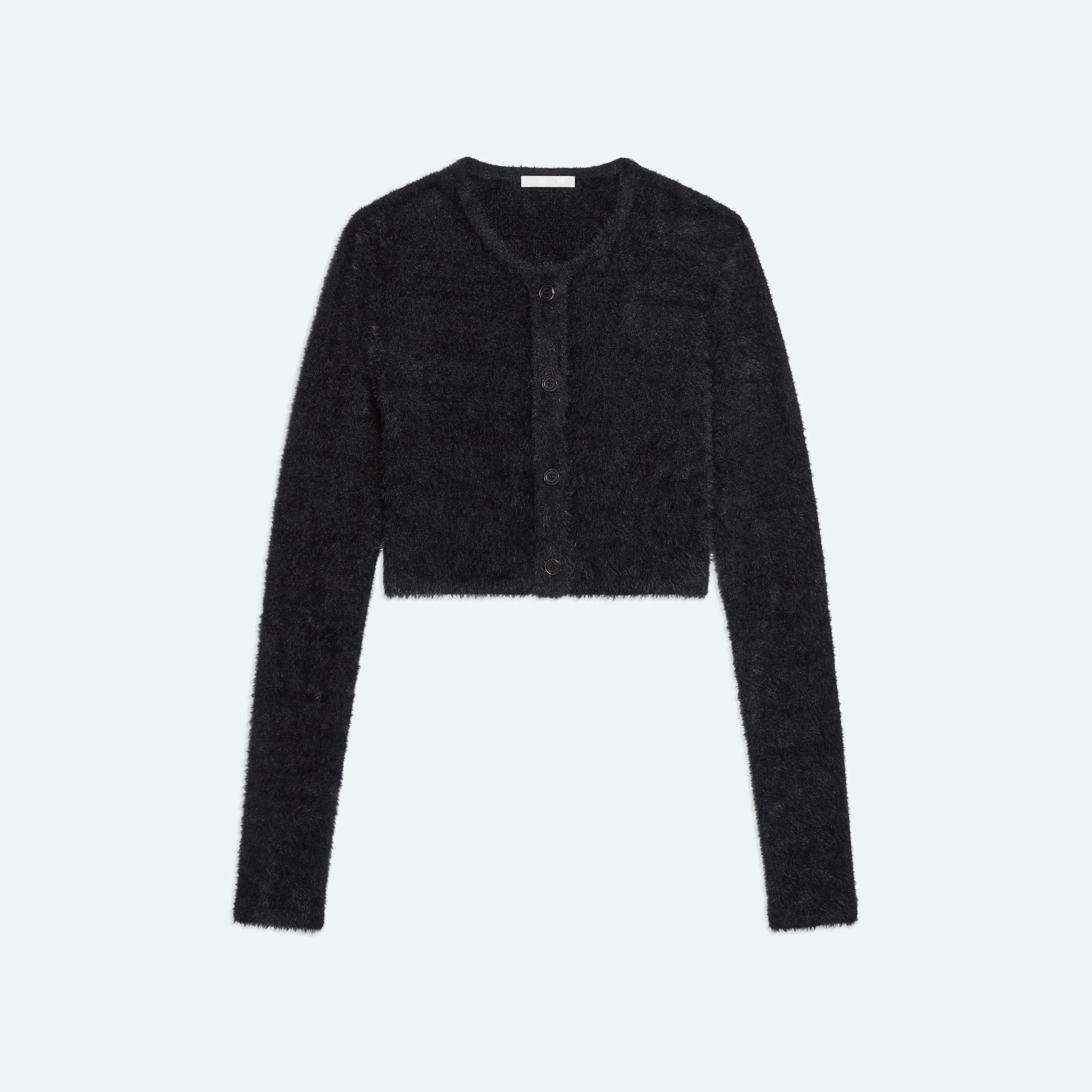 Crewneck cardigan in a feathery eyelash knit. Matches the Sweater Mini Skirt. BLACK: Fits true to size. Model is 5'10" and wears size S. RED: Fits true to size. Model is 5'11" and wears size S. DETAILS - Eyelash knit - Crewneck - Button front closure - Slim fit - P07HW701 MATERIALS & CARE - Composition: 100% nylon - Dry clean with any solvent except trichloroethylene. - Finished Garment Manufacturing Country/Region: China - Fabric Production Country/Region: China - Dyeing Country/Region: (of fabric) China - Finishing Country/Region: (of fabric) China - Spinning: (of fabric) China