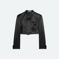 Cropped blazer in duchesse satin with a stand collar and structured shoulders. Matches the Minimal Satin Pants. Fits true to size. Model is 5'11" and wears size 2. DETAILS - Stand collar with closed lapels - Hook-and-eye front closure - Welt pocket - Vent on sleeves - Cropped, boxy fit - Fully lined - P10HW101 MATERIALS & CARE - Composition: 100% acetate; lining: 100% viscose - Professional dry clean only. - Fabric Production Country/Region: Japan - Weaving Country/Region: (of fabric) Japan - Dyeing Country/Region: (of fabric) Japan - Finishing Country/Region: (of fabric) Japan