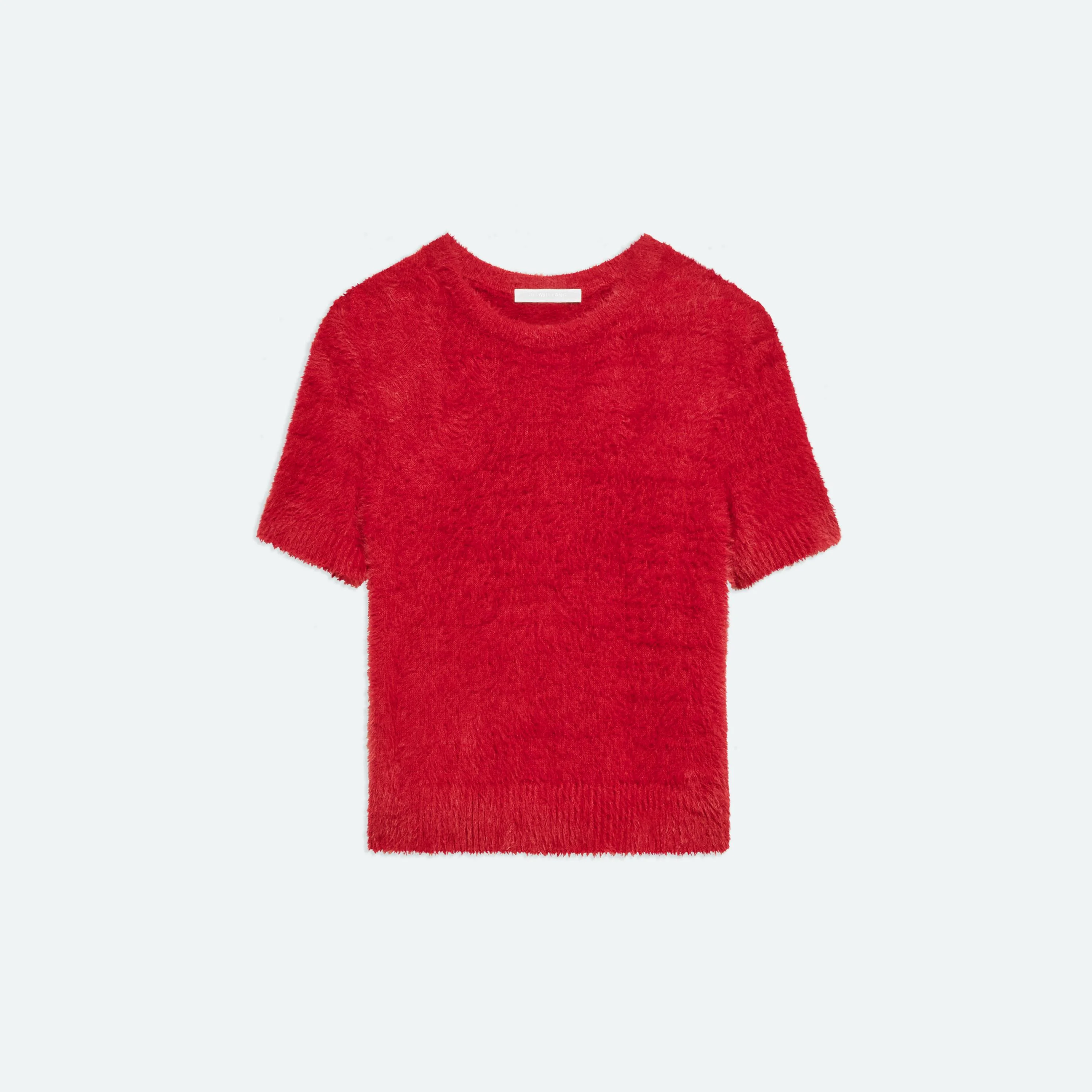 Knit baby tee in a feathery eyelash knit. Matches the Sweater Mini Skirt. BLACK: Fits true to size. Model is 5'11” and wears size S. WHITE: Fits true to size. Model is 5'11" and wears size S. RED: Fits true to size. Model is 5'10" and wears size S. DETAILS - Eyelash knit - Crewneck - Ribbed hem and cuffs - Slim fit - P07HW709 MATERIALS & CARE - Composition: 100% nylon - Dry clean with any solvent except trichloroethylene. - Finished Garment Manufacturing Country/Region: China - Fabric Production Country/Region: China - Dyeing Country/Region: (of fabric) China - Finishing Country/Region: (of fabric) China - Spinning: (of fabric) China