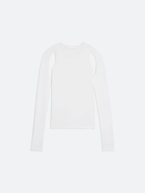 Fine gauge cotton sweater. Slim fit with cutouts at the underarms, cutouts are clean finished with self knit trims. Fits true to size. Model is 5’9” and is wearing size S DETAILS - Crew neckline - Long sleeves - Underarm cut-outs - O02HW703 MATERIALS & CARE - Composition: 83% Cotton, 13% Poly Amid, 4% Elastane - Dry clean, Normal cycle, any solvent except trichloroethylene - Finished Garment Manufacturing Country/Region: China - Fabric Production Country/Region: China - Dyeing Country/Region: (of fabric) China - Finishing Country/Region: (of fabric) China - Spinning: (of fabric) China